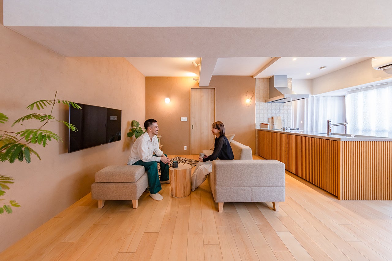 塗り壁の凹凸が陰影をつくり、味わいとやすらぎの空間を演出します。そこに洗練された北欧家具と、施主様の地元・沖縄を感じる色味をミックスし、自分たちの好きが詰まった空間の魅力が生まれ、より愛着が湧く住まいとなりました。