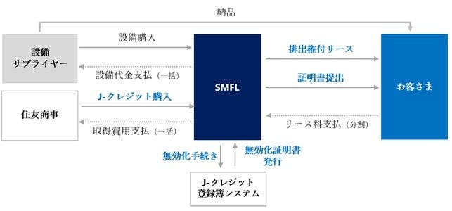 本商品は、リース物件の導入企業が利用用途に応じてJ-クレジットの種類・数量を選択し、SMFLが住友商事から購入したJ-クレジットを付加して提供するリース商品です。リース期間中に見込まれる対象物件のCO2排出量をJ-クレジットで相殺するとともに、SMFLが無効化※3手続きを行います。排出権の知見と取引実績を有する住友商事が排出権サプライヤーとなることでJ-クレジットの安定的な調達が可能になります。