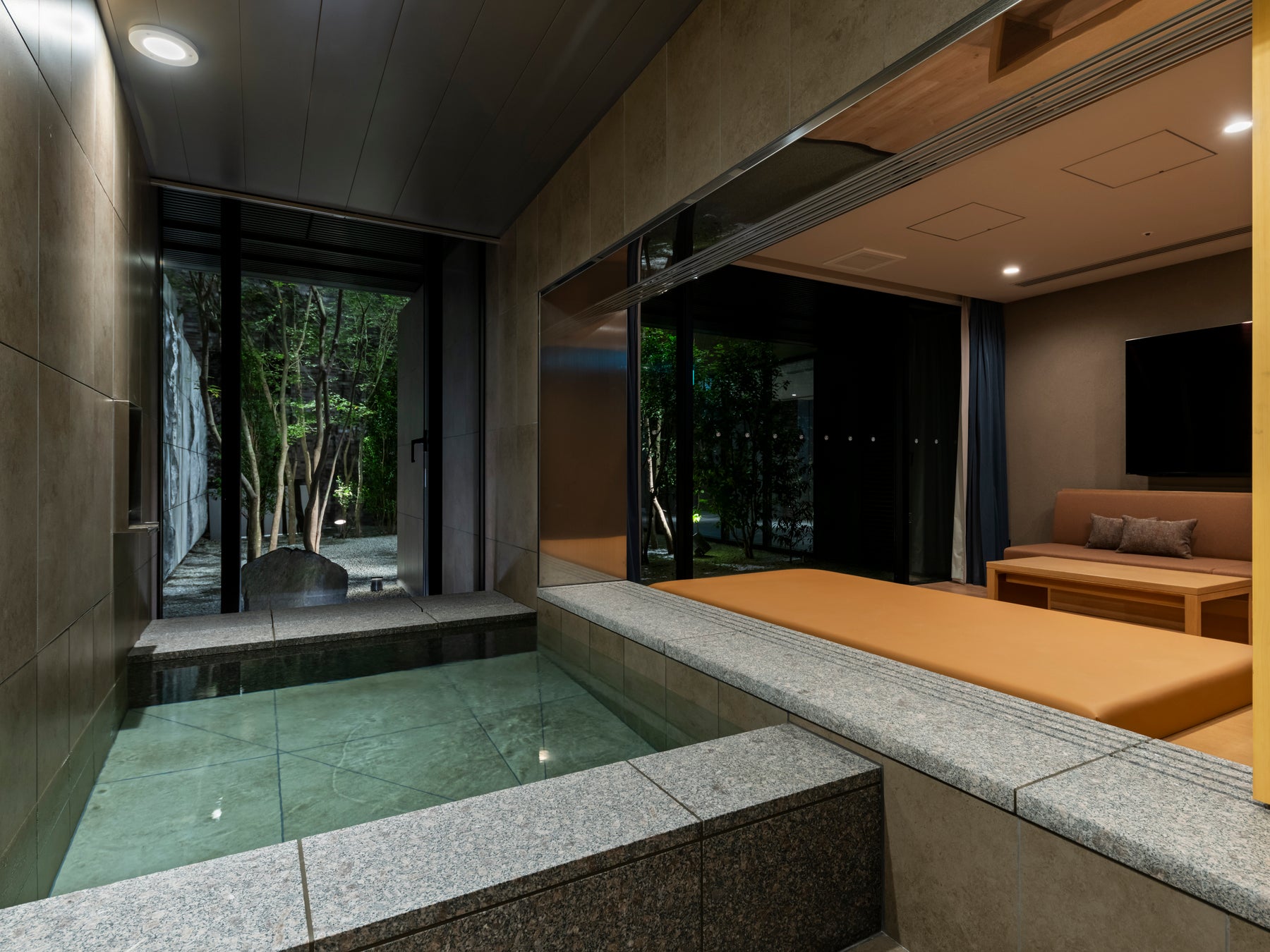 地下 1 階には、三井ガーデンホテルズとして初となる、完全予約制のプライベートバス(水着でのご利用も可能)を設 置。中庭を借景とした浴場とリビングエリアがシームレスに繋がり、浴場に居ながらもご家族や友人と対話ができ、ここだけの特別な時間をお過ごしいただけます。