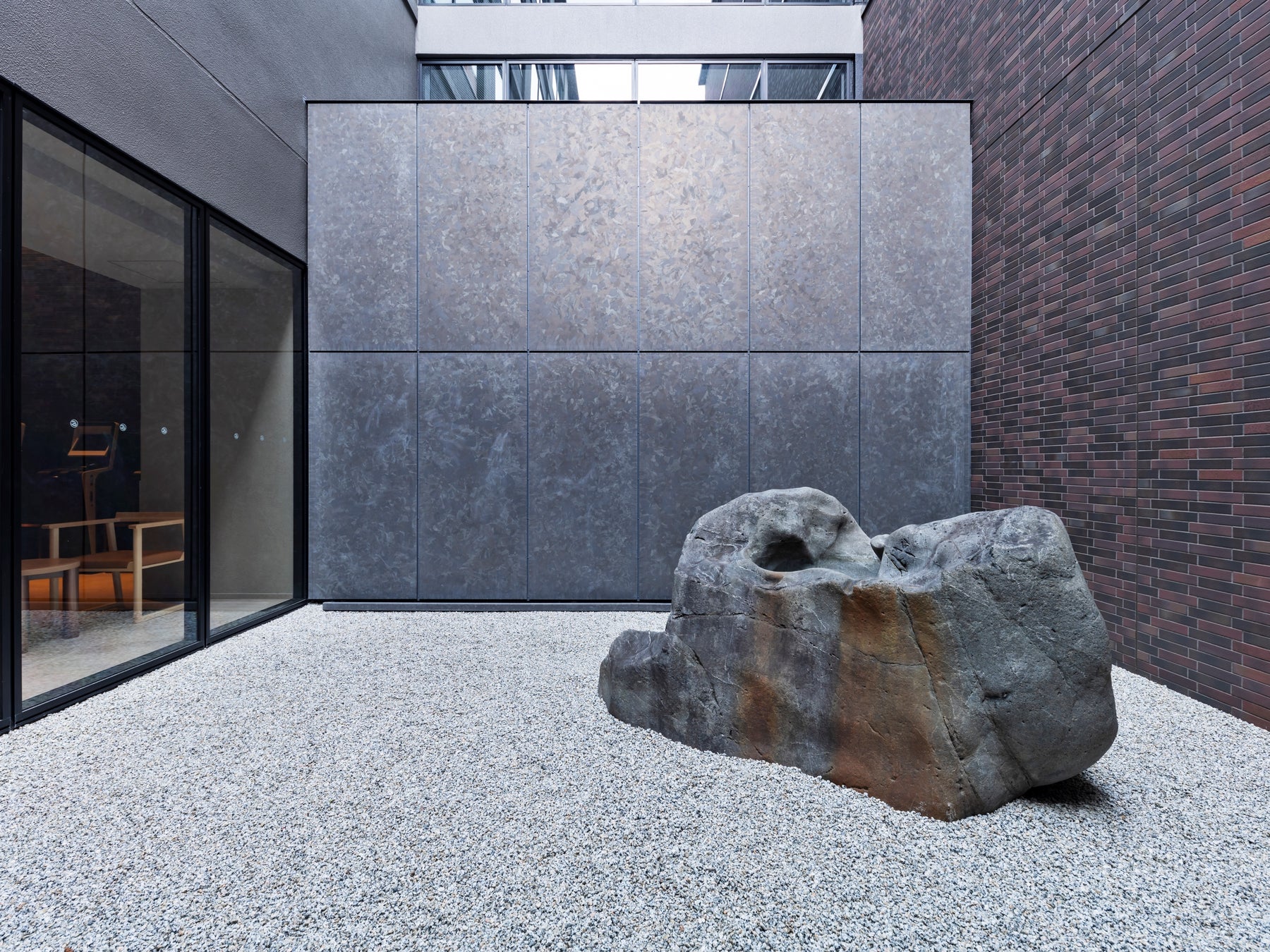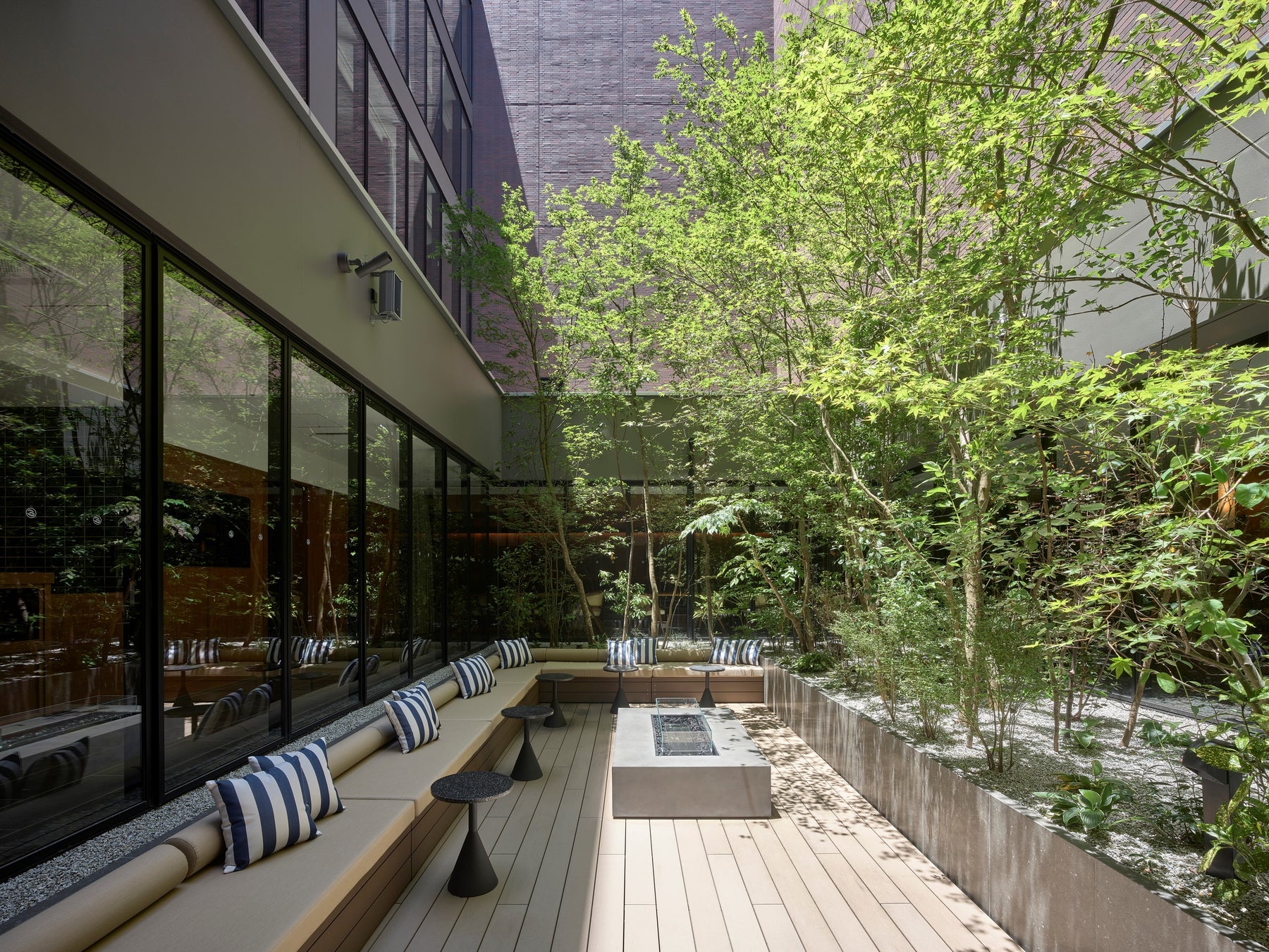中庭はロビーラウンジの間口いっぱいに面し、現代における「庭屋一如」の空間を構成。シンボリックな高さ約 7m の柳や四季の気配を伝えるヤマモミジなどの彩り豊かな中庭が、ゲストにリビングスペースとしての心地よさを提供します。2 層吹抜のスケール感のある空間に、高さ約 4m の館内植栽を配置しました。
