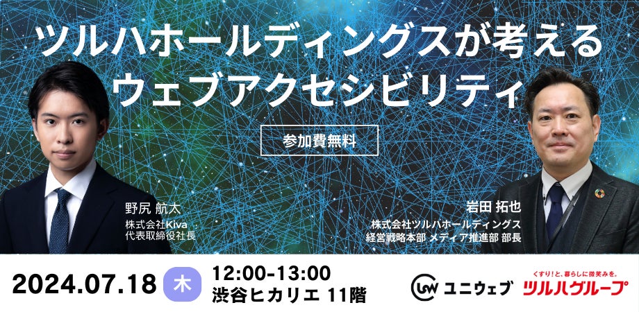 株式会社Kiva(本社:東京都中央区、代表取締役社長:野尻 航太、以下 Kiva)は、株式会社ツルハホールディングス(本社:北海道札幌市、代表取締役社長:鶴羽 順⽒、以下 ツルハホールディングス)の経営戦略本部メディア推進部・部長である岩田氏をゲストに迎え、「ツルハホールディングスが考えるウェブアクセシビリティ」セミナーを2024年7月18日(木)12時より開催いたします。