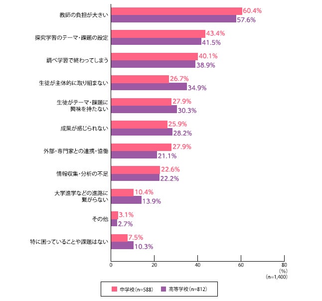 中学・高校の教員が、探究学習の実施について困っていることや課題に感じていることは、「教師の負担が大きい」(中学校60.4%、高校57.6%)が最も多く、次に「探究学習のテーマ・課題の設定」(中学校43.4%、高校41.5%)、「調べ学習で終わってしまう」(中学校40.1%、高校38.9%)、「生徒が主体的に取り組まない」(中学校26.7%、高校34.9%)、「生徒がテーマ・課題に興味を持たない」(中学校27.9%、高校30.3%)など、テーマ・課題設定や学習の進め方、生徒の主体性や意欲を高めることなどが課題として上位にあげられました。
