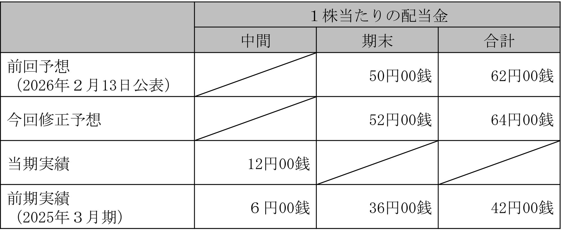 しかしその後、足元の業績着地見込みを見直した結果、将来の成長投資を勘案した上で期末配当を増額できることとなりました。つきましては、2026年3月期の期末配当金を1株当たり2円増配いたします。これにより、年間配当金は前回予想の1株当たり62円(期初の年間配当予想1株当たり50円)から64円となる予定です。