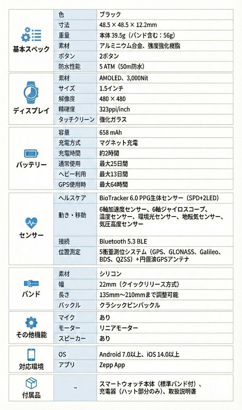 ●製品仕様について、詳しくは Amazfit 公式ウェブサイトをご覧ください。