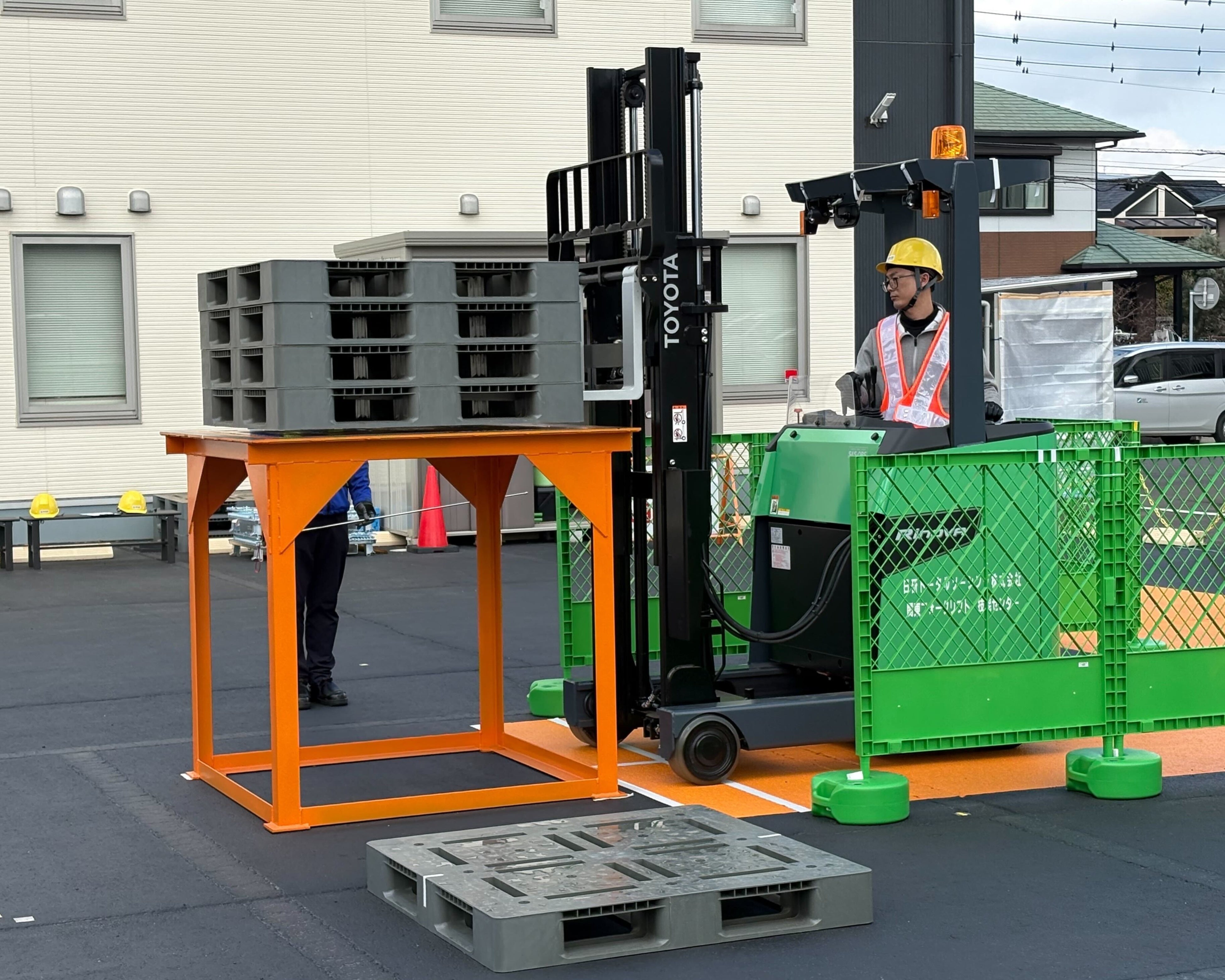 ・現在、製造現場でフィルムの梱包業務に従事していますが、勤務先では入社後数ヶ月での積極的なフォークリフトの資格取得が推奨されており、現場の需要を強く実感しました。そこで、仕事の幅を広げ、キャリアアップを実現するために、今回の講習への参加を決めました。フォークリフトの操作は未経験でしたが、最新設備がそろう充実した環境で、実務に即した操作方法を基礎から安心して学ぶことができています。将来的には「玉掛け」などの関連資格にも挑戦し、さらなるスキルアップを通じて、着実にキャリアを築いていきたいと考えています。