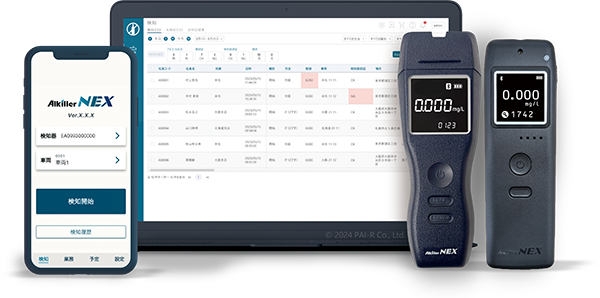 「アルキラーNEX」は、スマートフォンとアルコール検知器を連動させ、「いつ・どこで・誰が」アルコールチェックしたかを点呼記録と合わせてクラウドでデータ⼀元管理できるサービスです。
