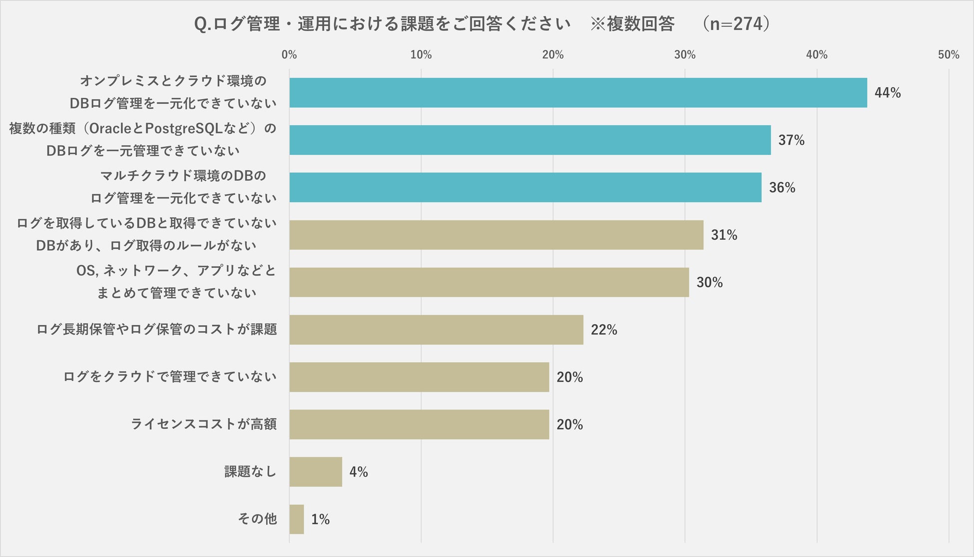 また同アンケートでは、ログ管理・運用における課題として、44%がオンプレミスおよびクラウド環境の、37%が異種データベースの、36%がマルチクラウド環境のログ一元管理ができていないことを挙げています。