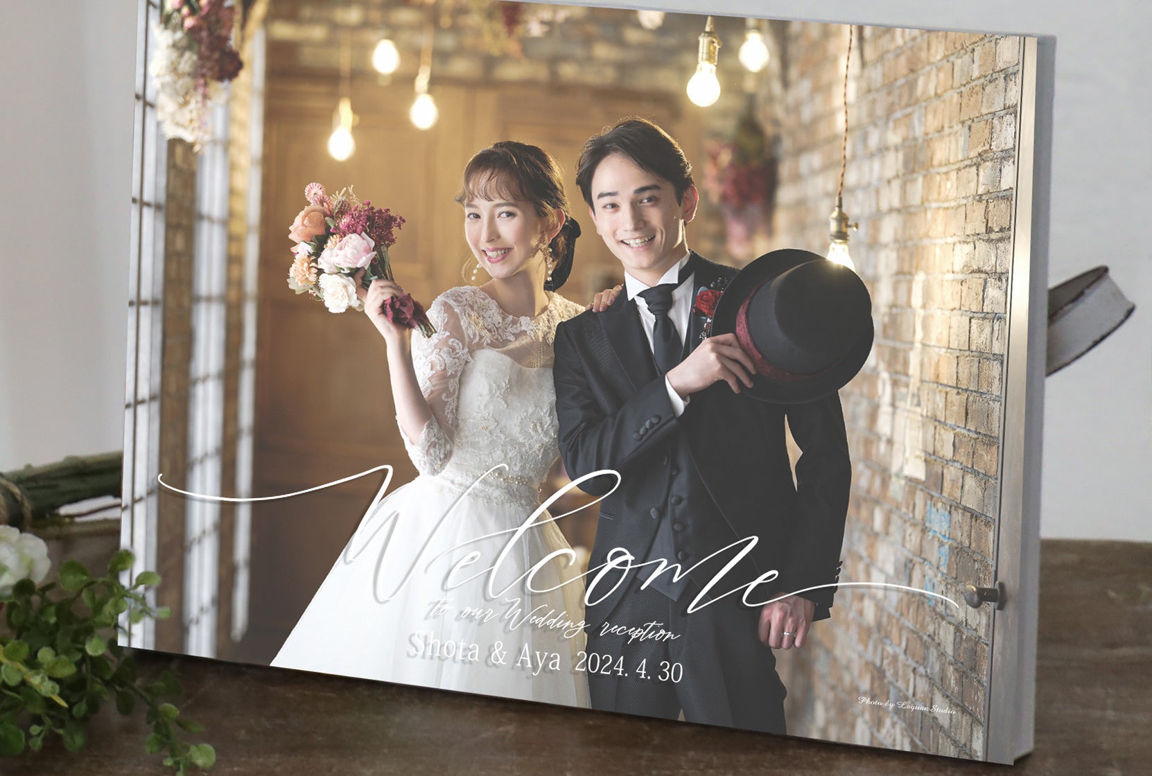 文字が入ったウェルカムボード風のパネル(420×297mm)。マット質感プリントを木枠に貼り込み、上品に仕上げた壁掛けパネルが特徴です。