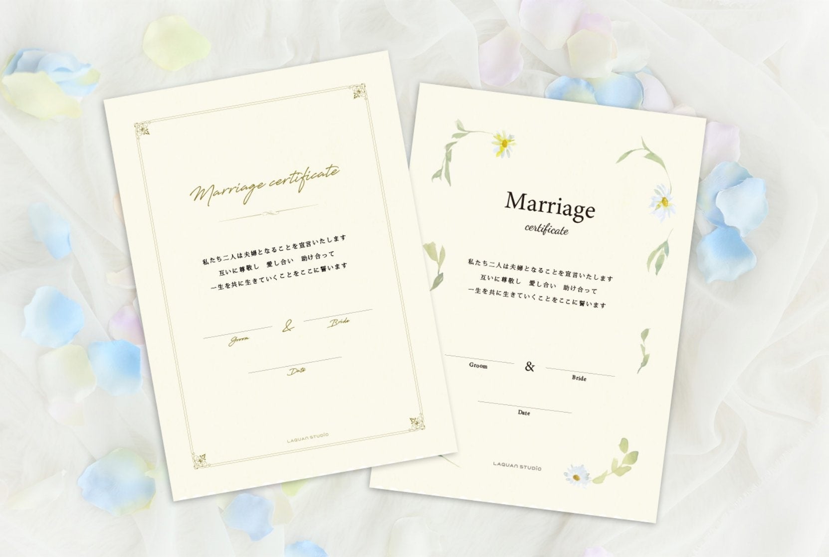 撮影前にサインしていただいて完成させる結婚証明書。フレームに入れて撮影するので、二人だけの特別をお届けいたします。