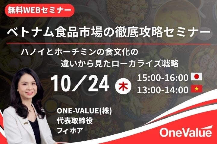 ベトナムに特化した経営コンサルティング企業であるONE-VALUE株式会社(東京都江東区、CEO:フィ ホア)は、無料ウェビナー「無料セミナー「ベトナム食品市場の徹底攻略セミナー 〜ハノイとホーチミンの食文化の違いから見たローカライズ戦略〜」開催のお知らせ」を、2024年10月24日(木)の15時より開催します。