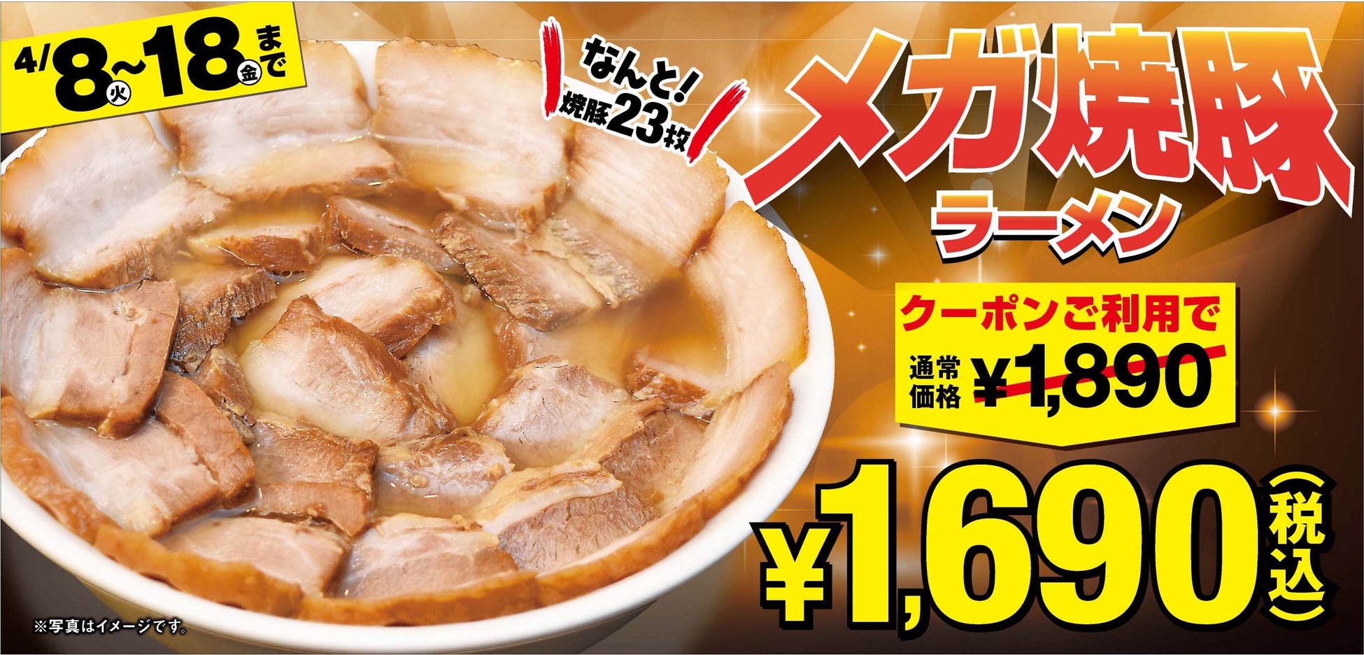 大人気企画をこの春も開催!こだわりのトロ旨焼豚(チャーシュー)を23枚、麺が隠れるほど豪快に盛り付けた「メガ盛り焼豚ラーメン」を11日間限定でご提供いたします。通常メニュー「焼豚ラーメン」の焼豚が13枚に対し、この「メガ盛り焼豚ラーメン」には、ほぼ2倍の23枚の焼豚を豪快にトッピング!圧倒的な見た目のインパクトとボリュームで坂内のコアファンをも唸らせ、毎回大反響をいただいております。また、本商品は公式モバイル倶楽部の紹介特典としてのみ食すことができる裏メニューとして常時展開しており、オンメニューで販売するのはこの『焼豚まみれ』期間のみ。肉厚な特製焼豚を食べても食べても麺にたどり着かない、限定メガ商品をぜひご体験ください。今回ももちろん、坂内を支えて下さっているファンの皆様への感謝を込めて、坂内公式モバイル倶楽部内でもお得なクーポンを配信いたします。坂内の喜多方ラーメンを支える“トロ旨焼豚”を心ゆくまでご堪能ください。