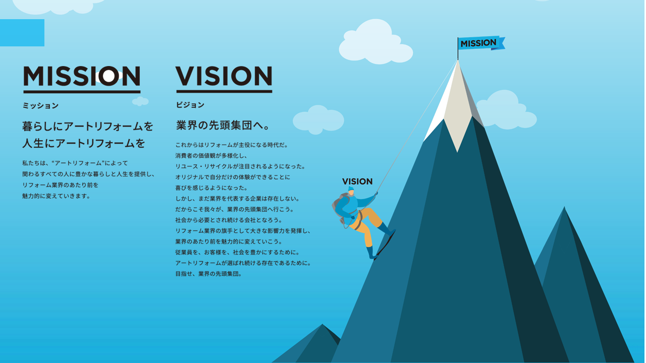 アートリフォームは「暮らしにアートリフォームを。人生にアートリフォームを。」というミッション、「業界の先頭集団へ」というビジョンを掲げ、リフォーム業界をけん引する先頭集団企業としてリフォームというサービス、業界をより魅力的に変え、社会の住環境の在り方を前進させていく企業を目指しています。
