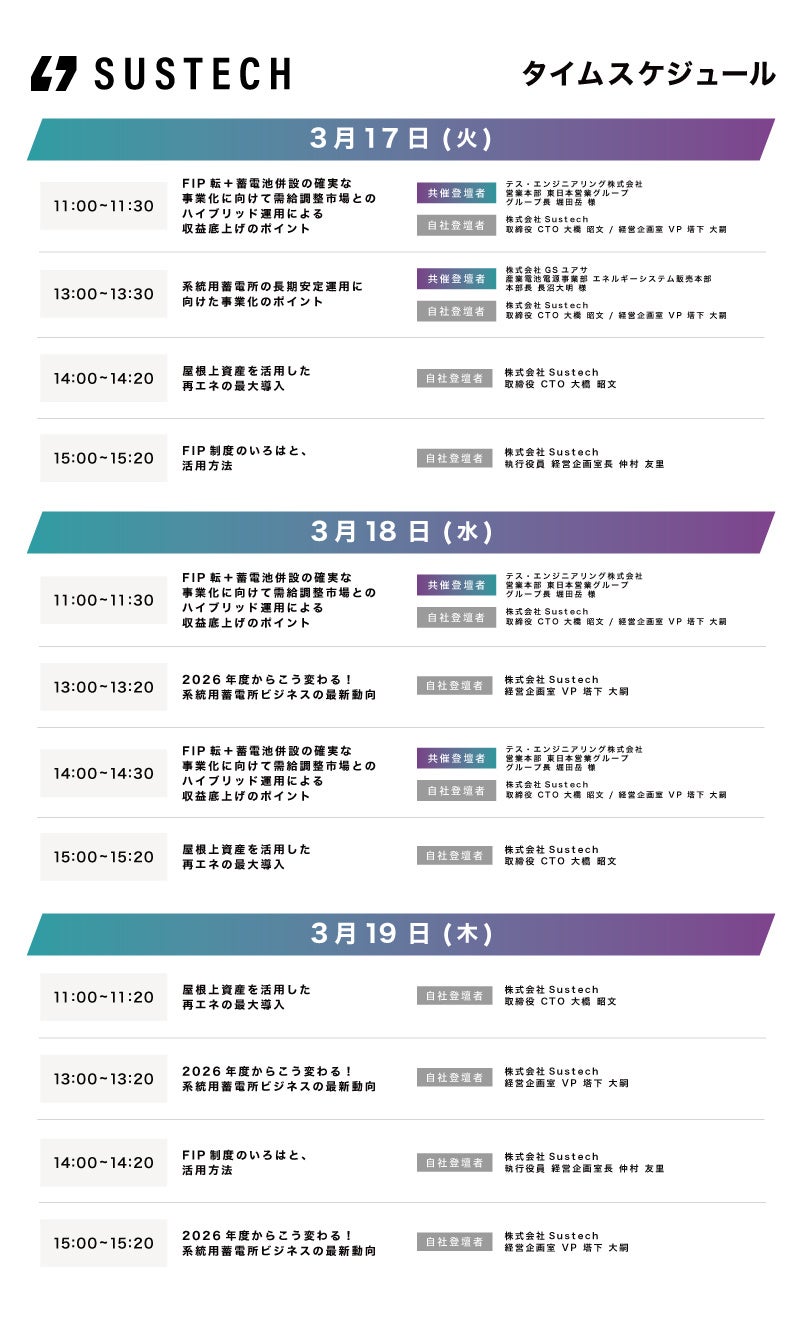本展示では、Sustechによる電力市場の最新動向などの解説セミナーと、パートナー企業様として、テス・エンジニアリング株式会社様及び株式会社GSユアサ様の専門担当者をお招きした特別対談セミナーを実施します。