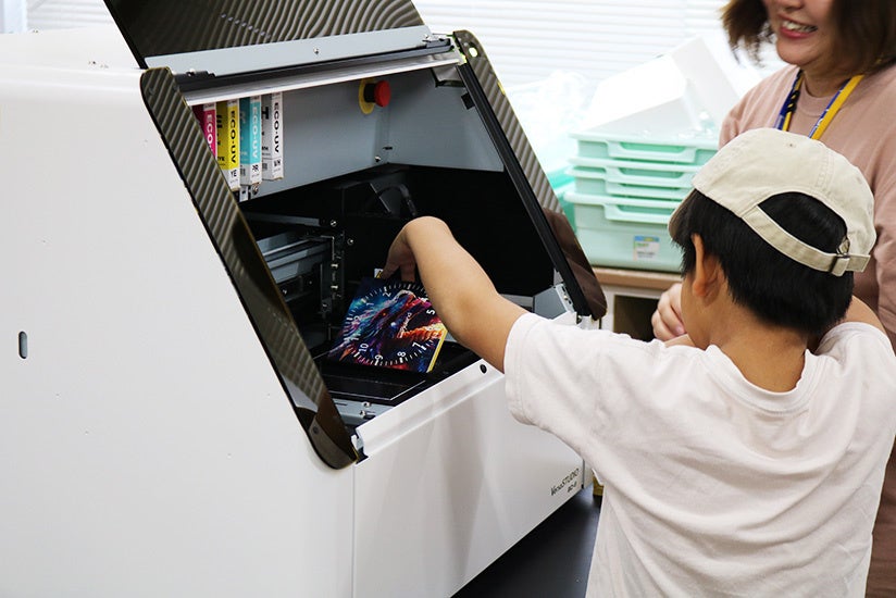 当社は昨年8月に浜松科学館(みらいーら)において、当社のUVインクジェットプリンターと画像生成AIでオリジナル時計を作成する「未来のモノづくりワークショップ」を行いました。このワークショップは、子どもたちにデジタル技術に触れる機会やデジタルリテラシーについての学びを提供するとともに、地域の企業に興味を持ってもらうことを目的に開催し、児童・生徒59人とその家族に参加していただくことができました。この取り組みが、「デジタル社会を生きる子どもたちに対し、最新技術に触れる機会と適切な知識を与える場を創出し、デジタル教育の推進に寄与している」と評価され、「特別賞」を受賞することができました。