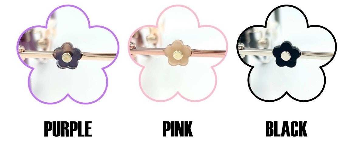 知的な印象の中に柔らかい雰囲気を演出するウェリントンシェイプ。シンプルなデザインですが、デイジーのパーツがアクセントとなり、横顔を可愛らしく彩ります。カラーは、パープル、ピンク、ブラックの3色。