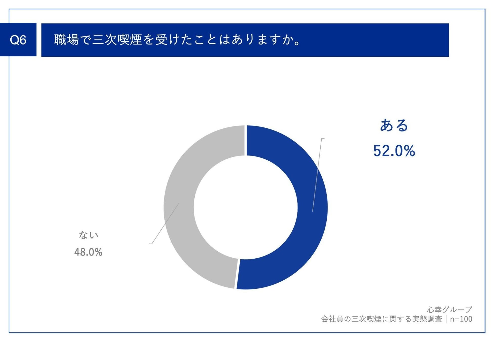 「Q6.職場で三次喫煙を受けたことはありますか。 」(n=100)と質問したところ、「ある」が52.0%という回答となりました。