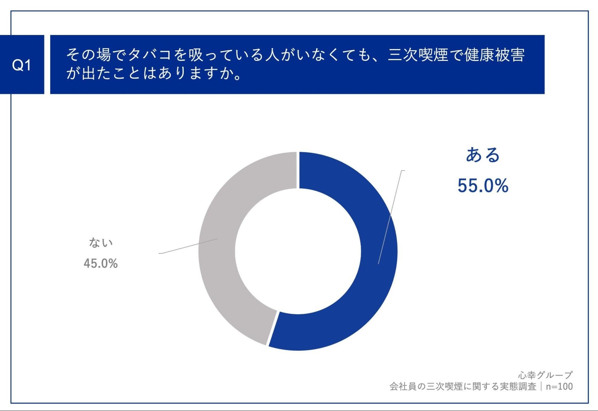 「Q1.その場でタバコを吸っている人がいなくても、三次喫煙で健康被害が出たことはありますか。」(n=100)と質問したところ、「ある」が55.0%という回答となりました。