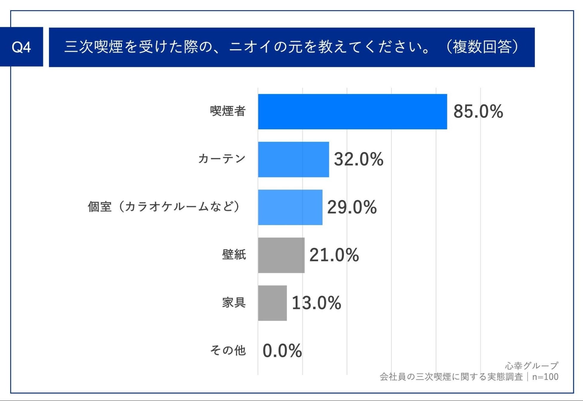 「Q4.三次喫煙を受けた際の、ニオイの元を教えてください。(複数回答)」 (n=100)と質問したところ、「喫煙者」が85.0%、「カーテン」が32.0%、「個室(カラオケルームなど)」が29.0%という回答となりました。