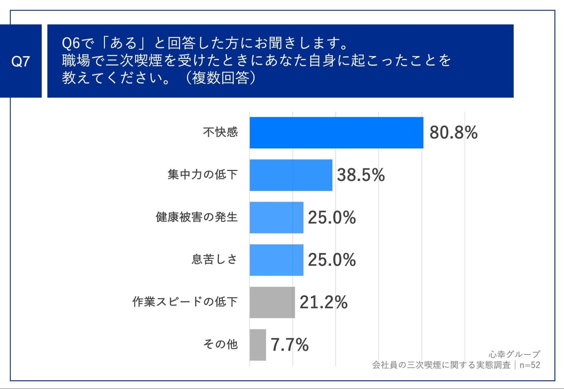 Q6で「ある」と回答した方に、「Q7.職場で三次喫煙を受けたときにあなた自身に起こったことを教えてください。(複数回答)」 (n=52)と質問したところ、「不快感」が80.8%、「集中力の低下」が38.5%という回答となりました。