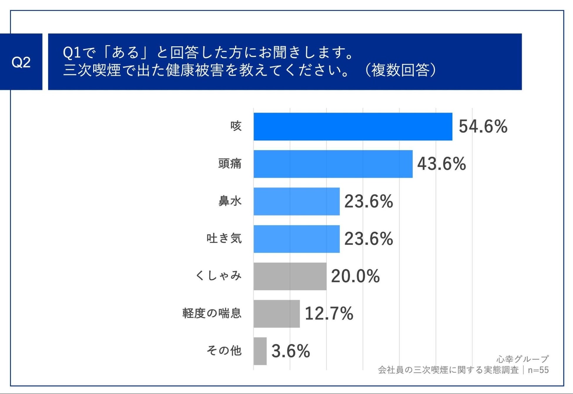 Q1で「ある」と回答した方に、「Q2.三次喫煙で出た健康被害を教えてください。(複数回答)」(n=55)と質問したところ、「咳」が54.6%、「頭痛」が43.6%、「鼻水」が23.6%という回答となりました。