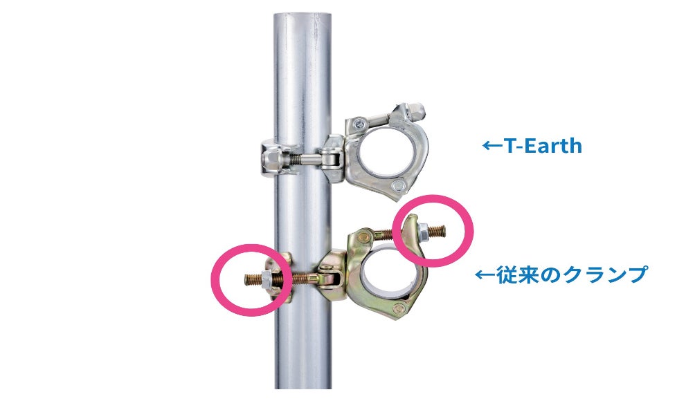 この状況に対処するため、タカミヤは、軽量パイプでも、安全性と強度に優れた新型クランプ「T-Earth」を開発しました。