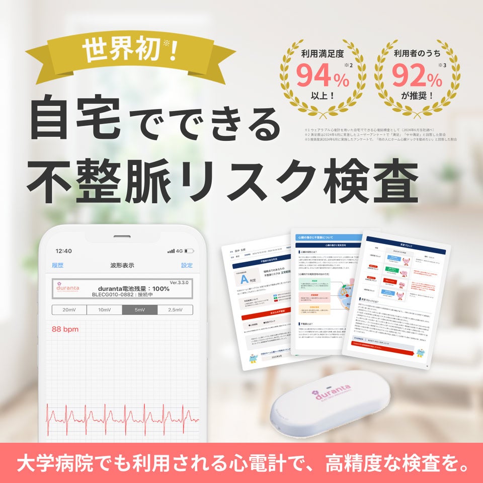 「ホーム心臓ドック®」は、小型心電計を胸部に装着し、自宅で9時間以上の心電図データを取得する医療テックサービスで、不整脈などの心疾患リスクに加え、睡眠の質や無呼吸、ストレス指標も同時に可視化。検査から医師のフォローまで自宅で完結するのが特徴で、外出困難な高齢者や仕事に忙しい現役世代でも手軽に利用できます。