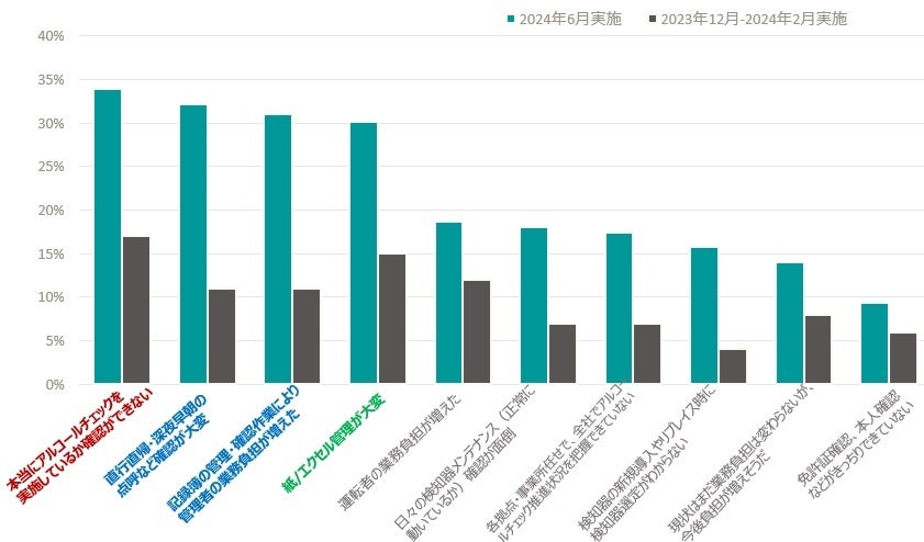 ② アルコール検知器使用義務化(2023年12月)以降の調査であり、安全運転管理者の課題感がより鮮明に。出張や直行直帰時の点呼、記録簿の管理などに関する業務課題が顕著に表れた。