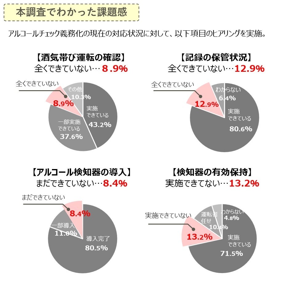 ① 約9割の企業がアルコールチェック義務化の対応を実施済みだが、約1割の企業はいまだにしっかりと対応できていないことが判明