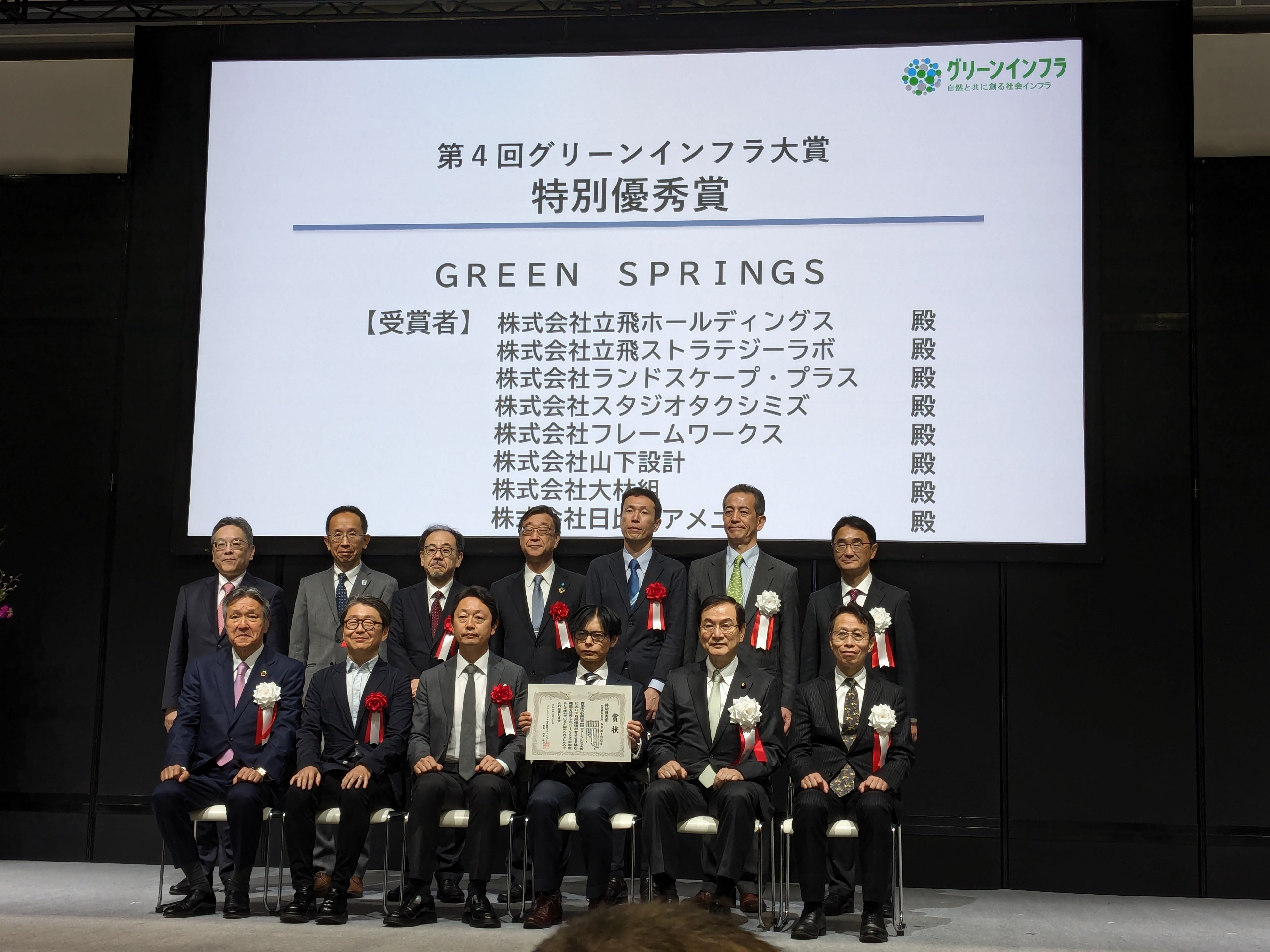株式会社立飛ホールディングス(本社:東京都立川市/代表取締役社長:村山正道)が事業主となり、株式会社立飛ストラテジーラボ(本社:東京都立川市/代表取締役:村山正道)が運営する複合施設GREEN SPRINGSが、この度、グリーンインフラ官民連携プラットフォーム(国土交通省主幹)が主催する第4回グリーンインフラ大賞において、特別優秀賞を受賞しました。