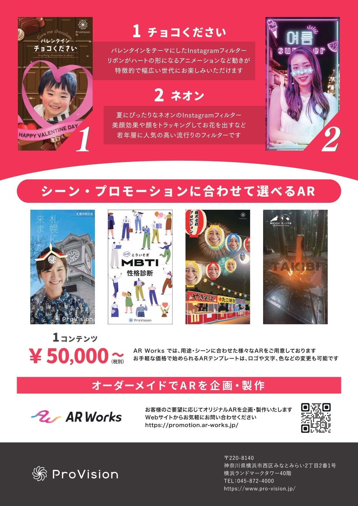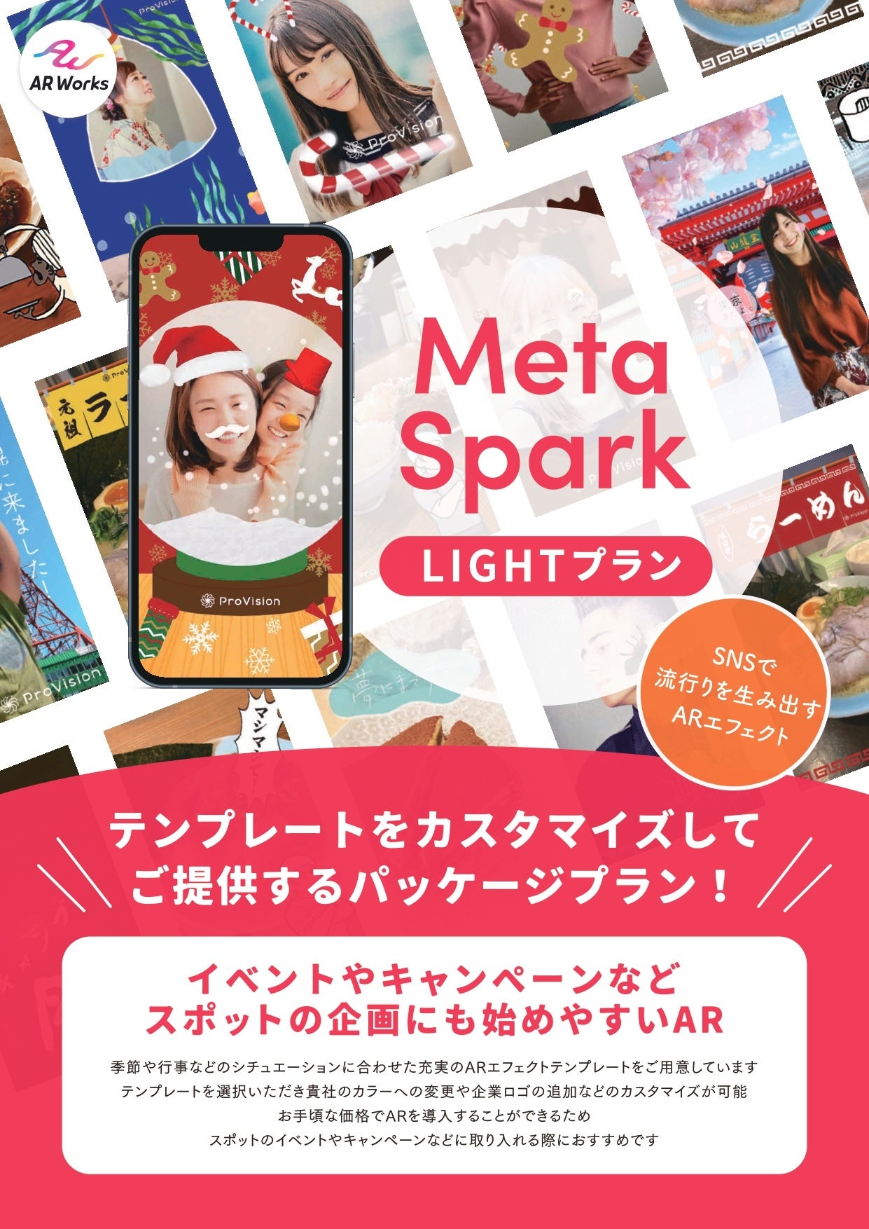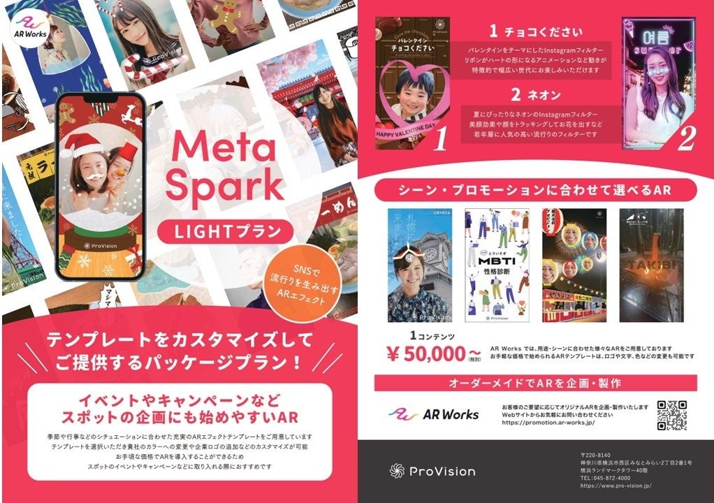 ProVisionのARコンテンツ制作サービス「ARWorks」では、スマホのウェブブラウザを利用したWebAR技術を活用し、QRコードを読み込むだけで手軽にAR体験ができるコンテンツを作成しております。この度は、テンプレートをカスタマイズするだけで手軽にオリジナルのARフィルターを作成することができる「Meta Spark LIGHTプラン」の提供を開始しました。