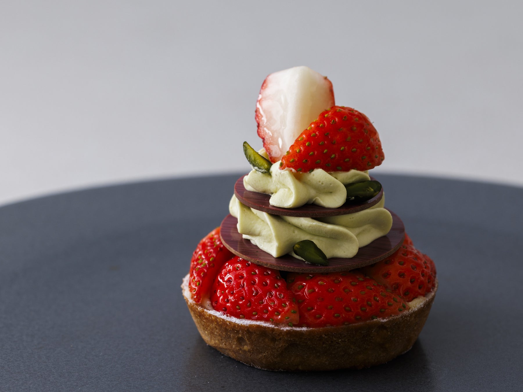 サクサクのタルト生地にフレッシュイチゴをふんだんに飾り、相性の良いピスタチオのクリームを組み合わせました。中には甘酸っぱいザクロとフランボワーズのジュレをアクセントに。