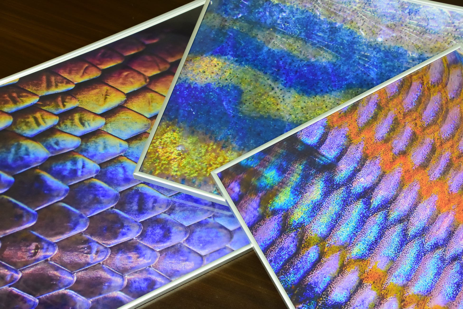 生きものの鱗や羽根など“自然がつくる色彩”にフォーカスした大型パネル展示。色の成り立ちや機能を解説し、観察ポイントを押さえた展示。パネルの写真を使用した缶バッチも販売します。パネルだけでなく、水の中を箱メガネを使って覗く水槽を用意し、水の中での色の見え方などを観察することができます。