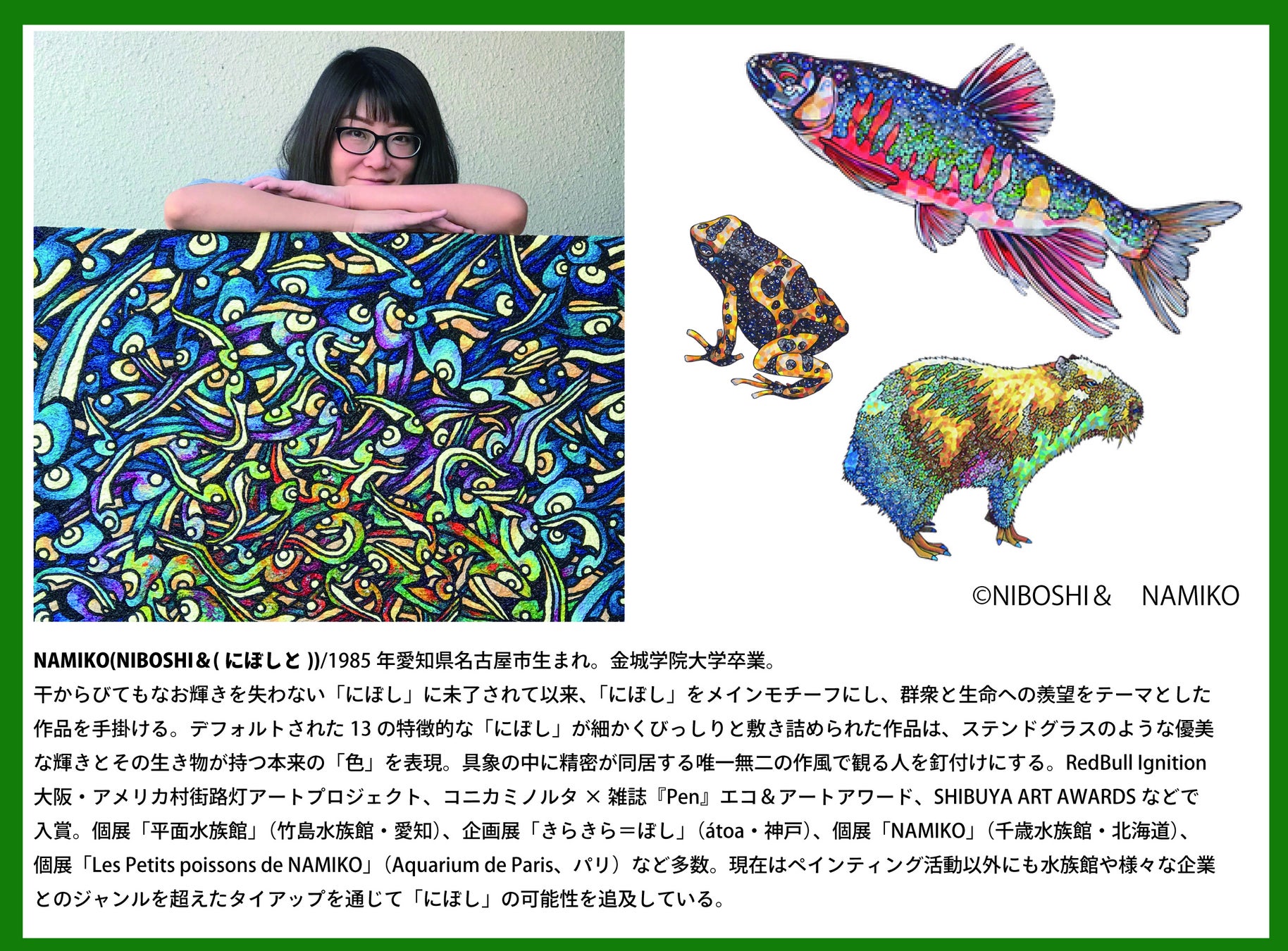 アーティストNAMIKOの複製画を館内に展示。作品と生きものをかけ合わせた展示は、色鮮やかで生きものの新たな魅力を提供します。関連グッズはオフィシャルショップで販売します。