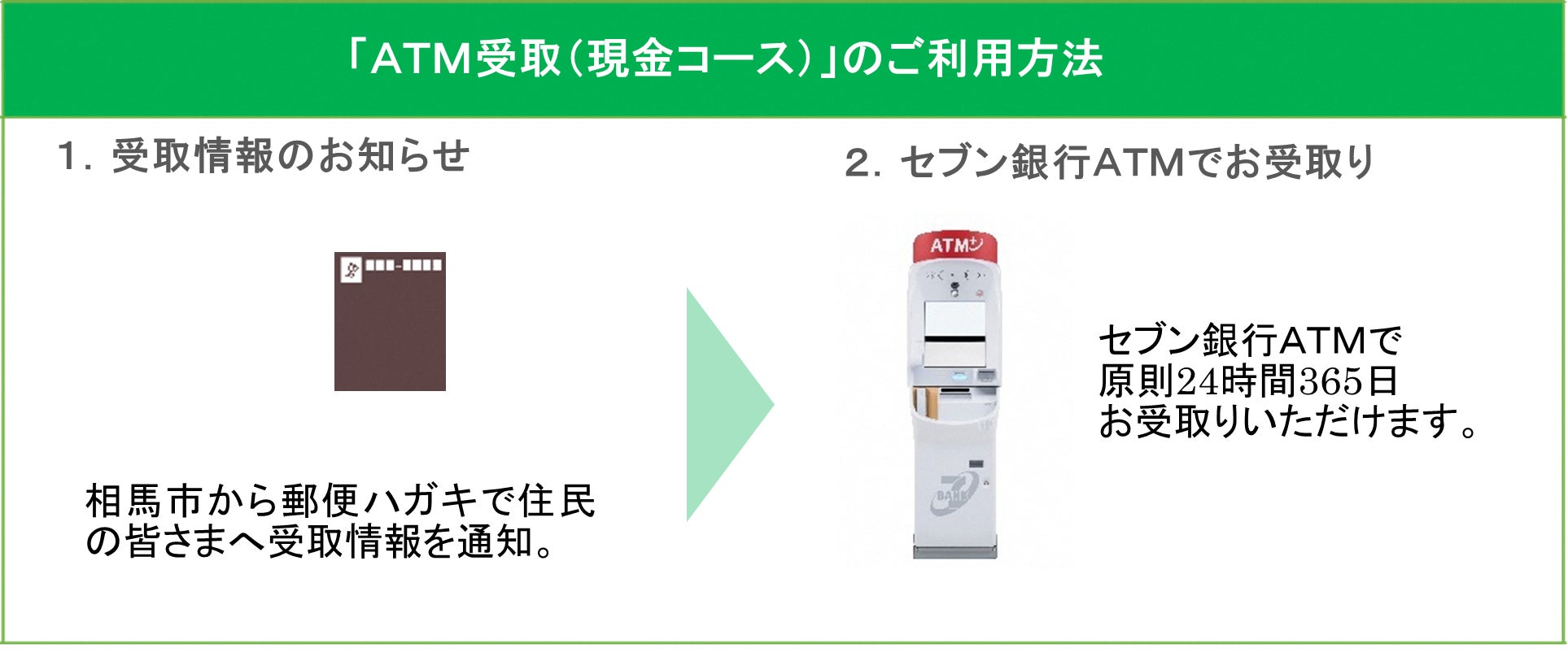 このたび、給付金の受取方法に「ATM受取(現金コース)」を活用いただくことで、住民の皆さまは、全国のセブン銀行ATMから、原則24時間365日、ご自身のライフスタイルに合わせて、手軽に給付金を受取ることができるようになります。