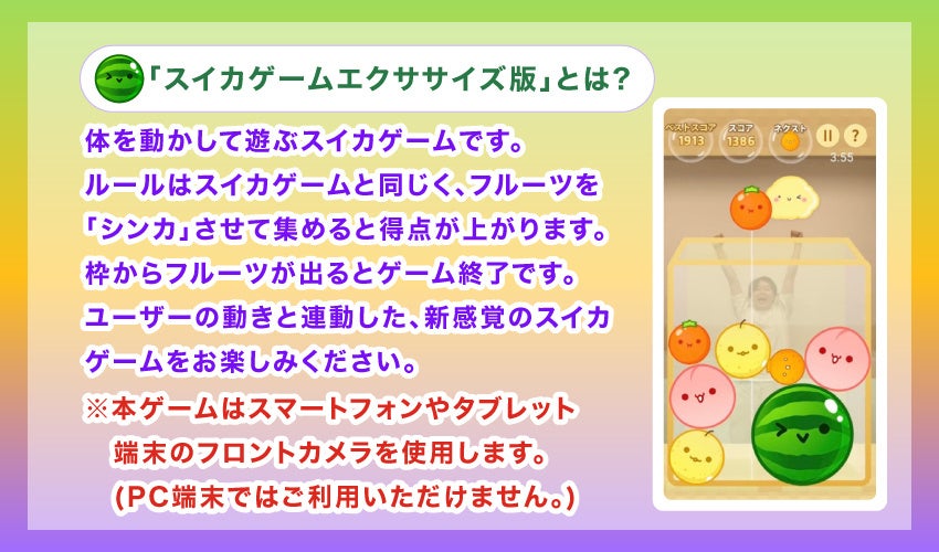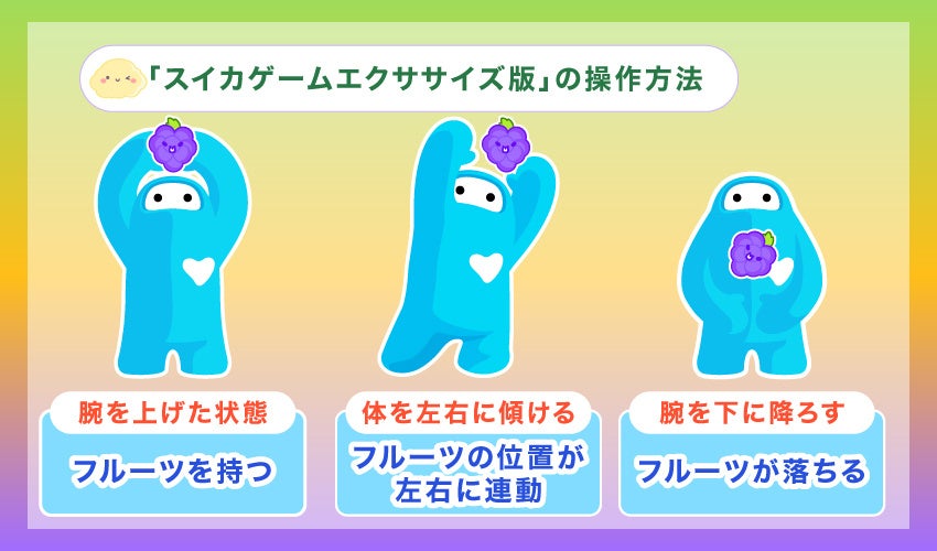 「スイカゲーム エクササイズ版」は、本家「スイカゲーム」で人気の可愛らしいデザインはそのままに、全身の運動で直感的に操作できるようにアレンジされた新感覚ゲームです。