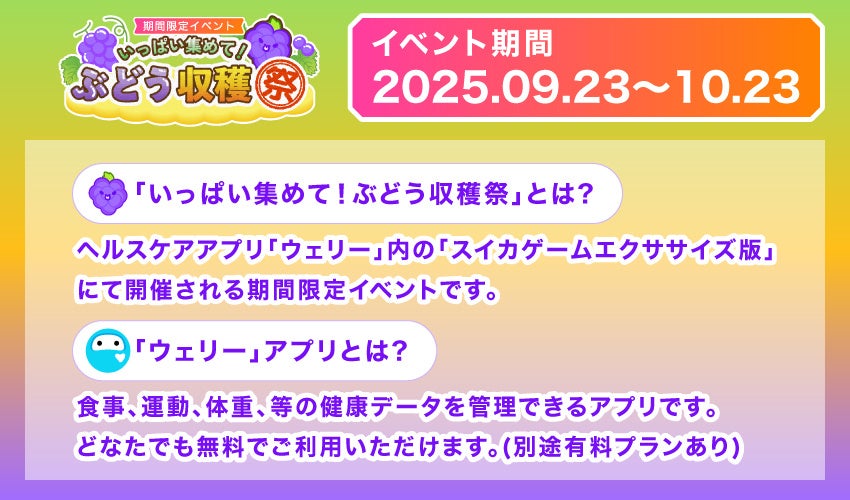 家族のカラダとココロの健康維持・増進をテクノロジーで実現する、東京大学発ヘルスケアスタートアップのissin株式会社(本社:東京都文京区 代表取締役:程 涛、読み:イッシン、以下「issin」)は、スマートフォン向けヘルスケアアプリ「ウェリー」内の人気ゲーム「スイカゲーム エクササイズ版」において、期間限定イベント「いっぱい集めて!ぶどう収穫祭」を「ぶどうの日(*1)」にあたる2025年9月23日から開催します。