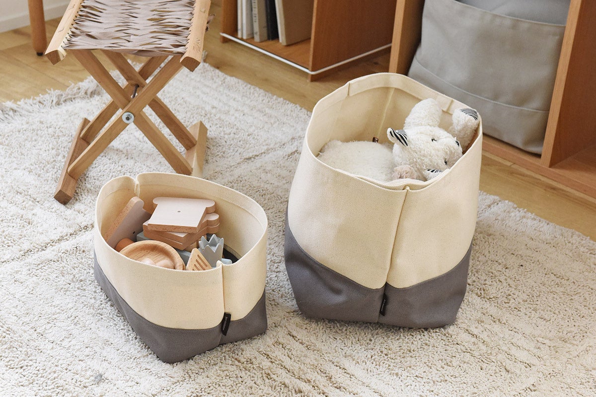 20オンスの厚手の帆布素材で作っているので、物が入れやすく、しっかりと自立。肉厚な素材感なので、本や子どもの木のおもちゃなど、重いものも入れられます。また、内側には汚れが付きにくいコーティングが施されているのもポイント。