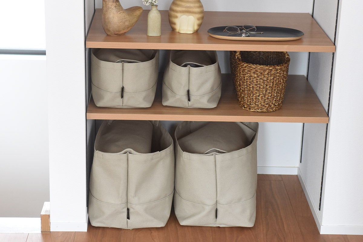 棚と組み合わせて収納する際にすっきり使えるように、以前の持ち手が長めのトートタイプの旧デザインから、Sサイズは持ち手なしに、Lサイズは内側にコンパクトな持ち手付きのデザインへ変更。