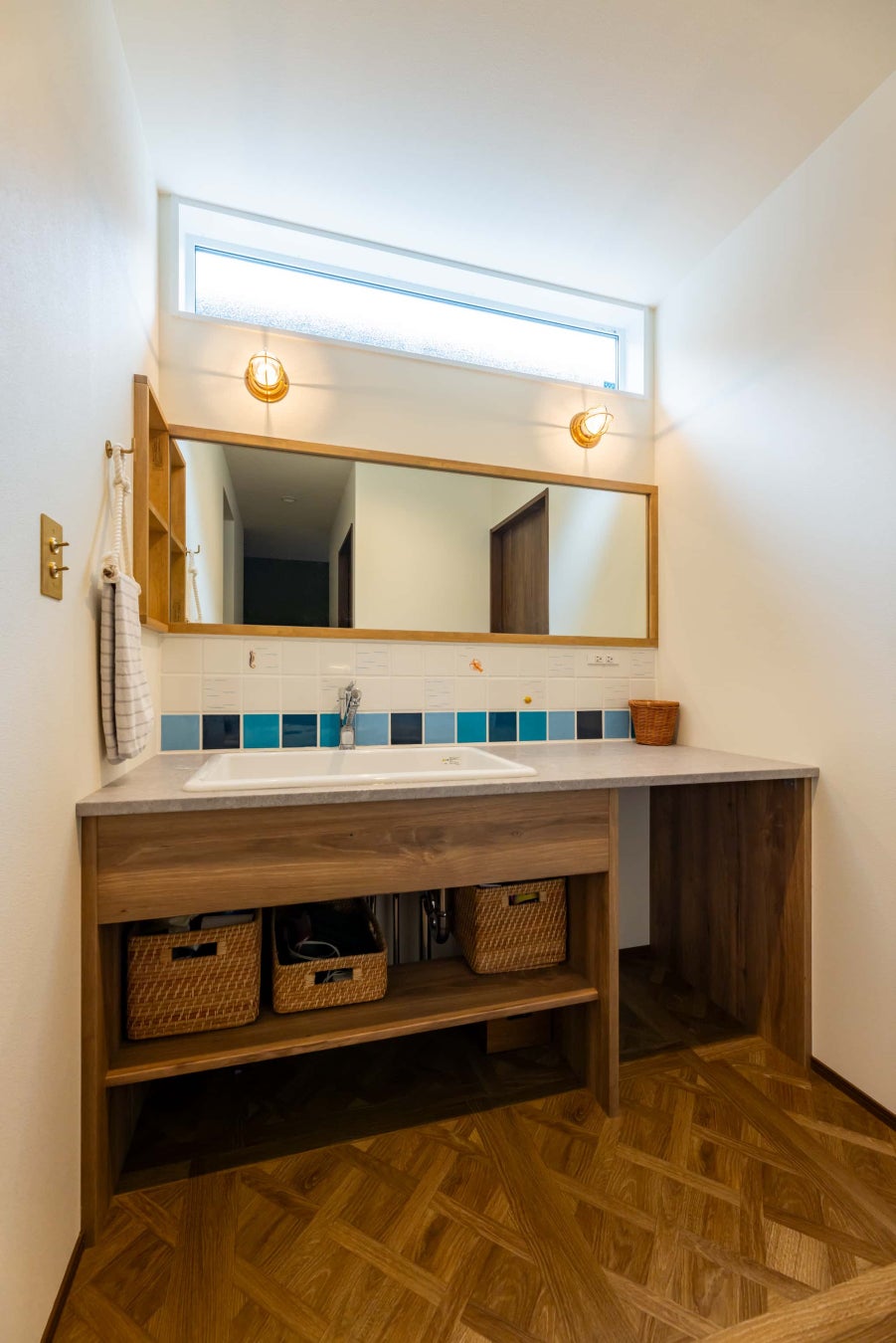 ホールからも目に入る洗面台は、海の生き物が描かれたタイルとマリンランプの照明、ロープと流木のタオル掛けで統一感のあるマリンテイストの空間に仕上げました。造作の幅広なミラーには小物を置ける収納ニッチを加えることで収納力UP。