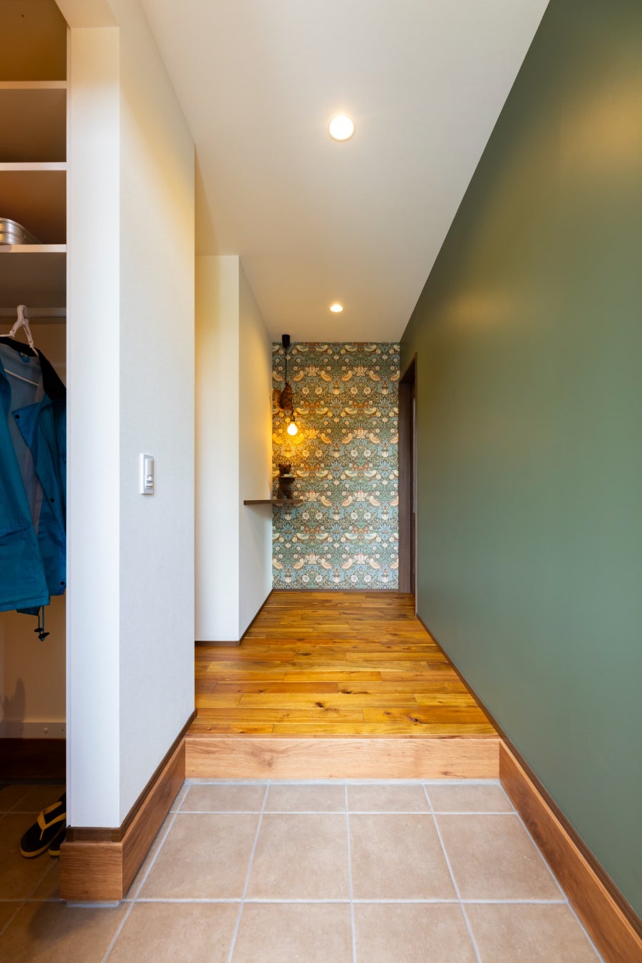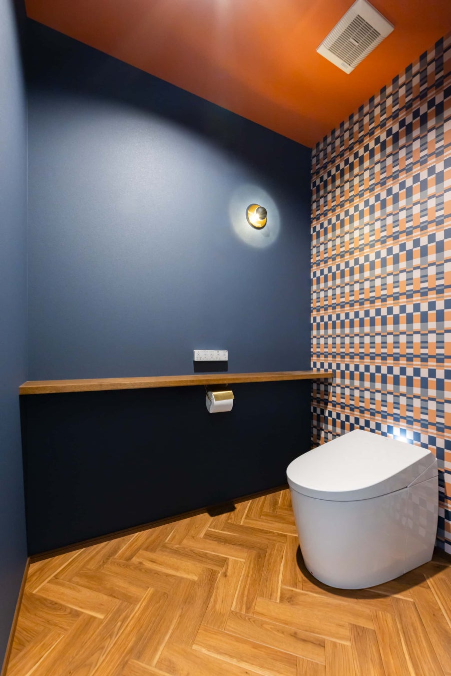 玄関は、ウィリアムモリスの柄クロスとレトロなカラーのアクセントクロス、三角形の飾り棚でディスプレイを楽しめるゆとりのある空間になっています。トイレはミッドセンチュリーをイメージした個性的な柄クロスを馴染ませる為、全体をネイビーの壁とオレンジの天井で貼り分けました。個性的なデザインの照明を選ぶことで、華やかでありながらレトロで落ち着いた印象の空間に。