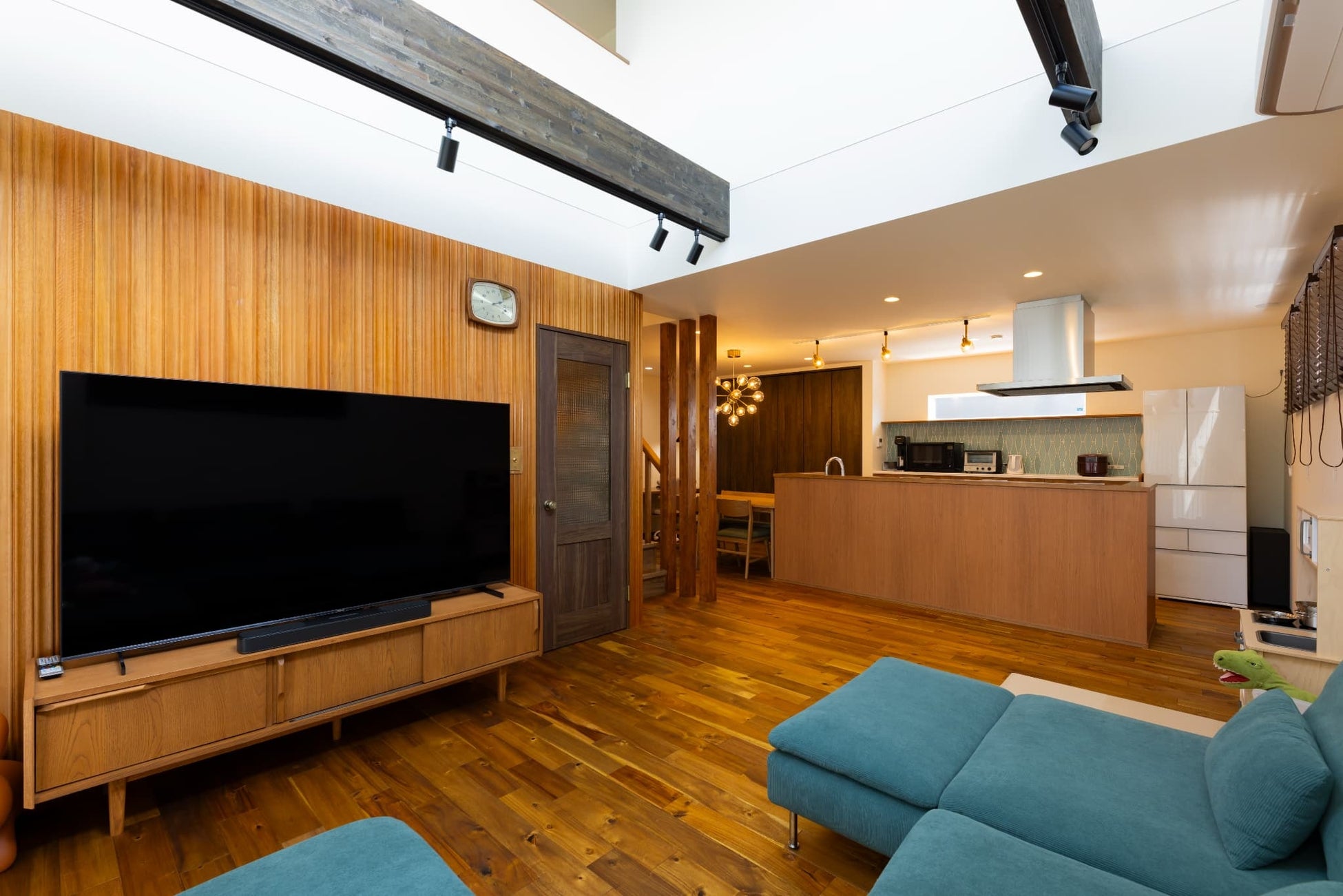 ミッドセンチュリーのイメージを主軸に、注文住宅でしか叶えられない個性的なインテリアを追及。レトロなアイテムも現代のお家にマッチする様、モダンな印象も加えています。また化粧梁や無垢床など木目を意識したデザインに加え、吹き抜けの開放感で唯一無二のお家が完成しました。