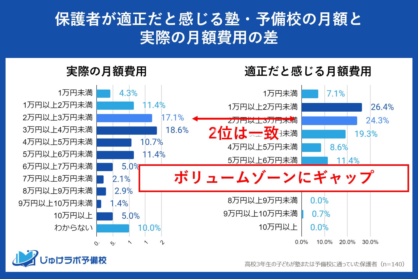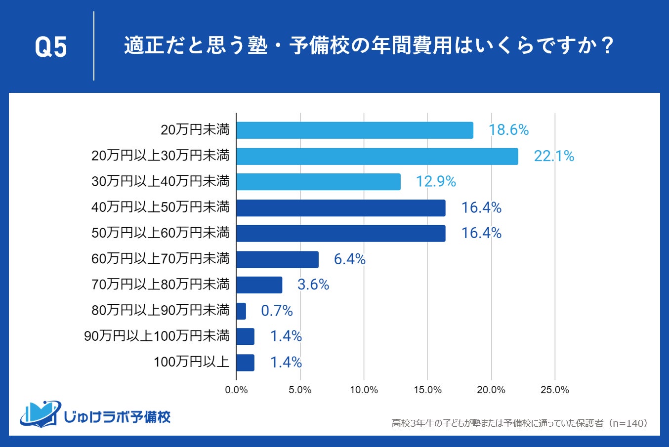 じゅけラボ予備校(所在地:大阪市北区、代表取締役:後藤智則)は、現在、塾または予備校を利用している高校3年生の保護者140名を対象に、塾や予備校の費用に関する教育費調査を実施しました。
