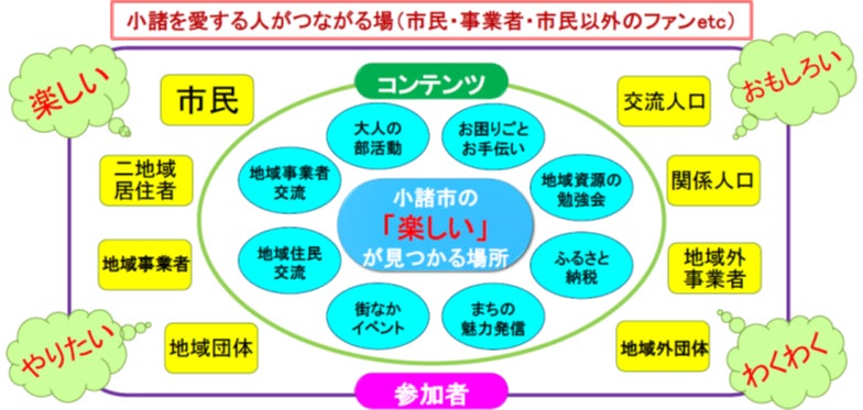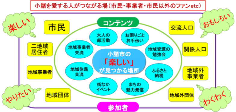 1)小諸に関わる人が、自分自身にとって楽しいことを見つけ、企画、実践、参加など行動を起こすことで、人と繋がり、小諸の魅力の新たな発見に繋げ、関わる人の「小諸愛」の深化を図る。