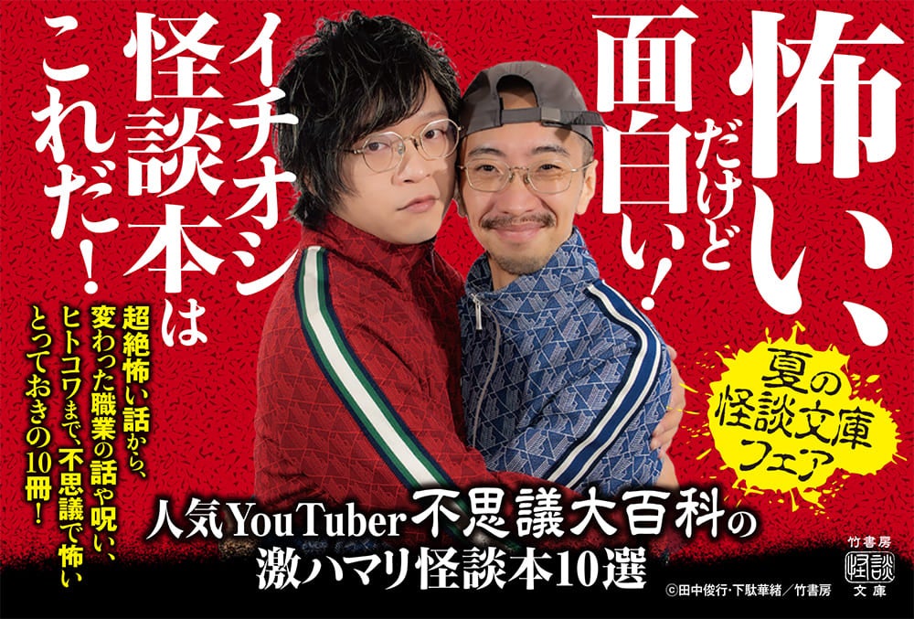 怪談YouTuberとして人気の下駄華緒さんと田中俊行さんが、小社のホラーレーベル「竹書房怪談文庫」から、不思議で怖いとっておきの10冊を選出しました。二人のブロマイド風両面カード(複製サインと特典動画QRコード付き)を参加書店にて配布いたします。