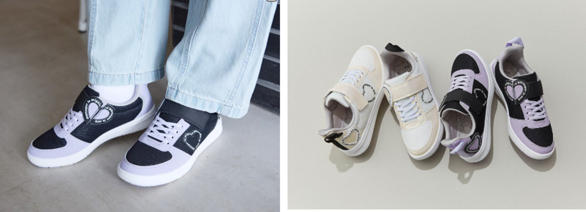 「ifme CALIN ハートリンクスニーカー」は、左右の靴を合わせると、アッパーのベルト部分に1つのハートが現れるデザインを施しています。ブラックとホワイトの2色展開となっており、メッシュ部分にはラメ入り素材を採用しています。落ち着いた色合いで上品さを演出しながらも、カジュアルなデザインとハートの仕掛けで、アクティブなトレンドファッションにもぴったりの一足です。友達とお揃いにすれば、2人でハートをつくって楽しむこともできます。