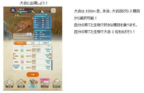 一定回数お世話を行うと生物を大会に出場させてアプリ内の他の生物と競争させ、結果に応じてアイテムや報酬が手に入ります。大会には「100m走」「水泳」「大岩投げ」の3種類の種目があります。それぞれの種目でランクが分かれており、高ランクになるほど報酬もアイテムや報酬も豪華になりますが、勝利するために高い能力が必要になります。