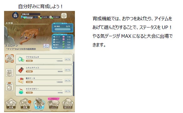 復元させた育成対象の動物に「あそぶ」「おやつ」「おみやげ」「ともだち」で育成アイテムを使ってお世話することで生物の能力を上げることができます。能力には「スピード」「パワー」「スタミナ」「器用さ」「魅力」があり大会での競争結果に影響します。