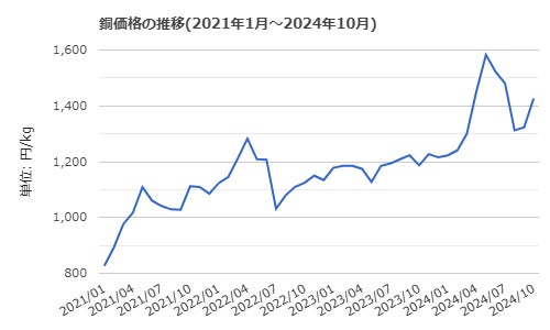 もう一つの悩みどころは価格です。「世界経済のネタ帳」を参考にすると、円建て銅価格は年々上昇しています。今年の5月には約1600円/kgの高価格を記録しました。銅の需要増加に伴いドル建て銅価格も上昇していますし、現状円安も進行しているため、円建てでは銅価格をさらに押し上げています。今後も米国の経済政策によりドル円レートの先行き不透明な所です。これは、電力ケーブルの価格がさらに上昇する可能性を含んでます。