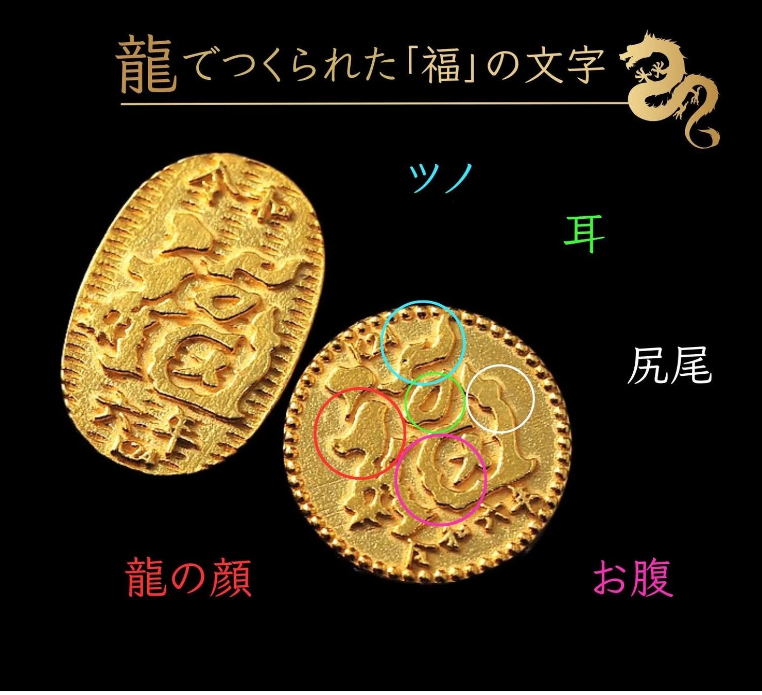小判とコインは、「福」の文字を龍で表現。よく見ると、龍の顔から尻尾までの身体で、「福」の文字をかたどっています。裏面には「龍」もしくは「辰」の文字と“K24”の刻印が入っています。