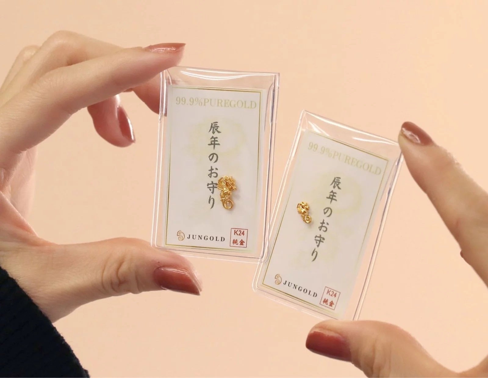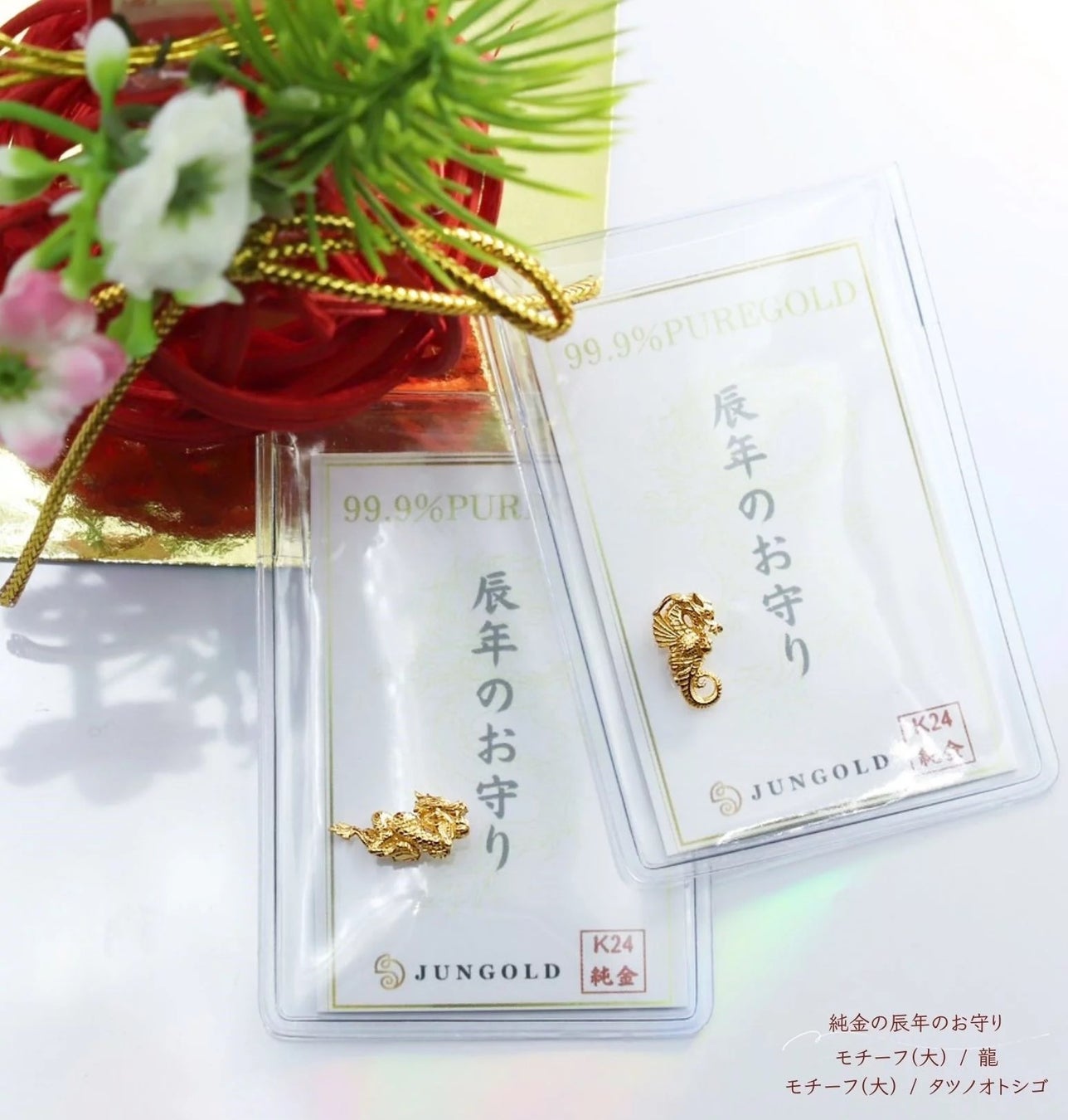 そんな「龍×純金」の最強タッグが叶うJUNGOLDの純金お守りは、お求めやすい0.3gからのミニチュアサイズからご用意しています。クリーマスプリングスには限定デザインの「タツノオトシゴ」も加わりました!